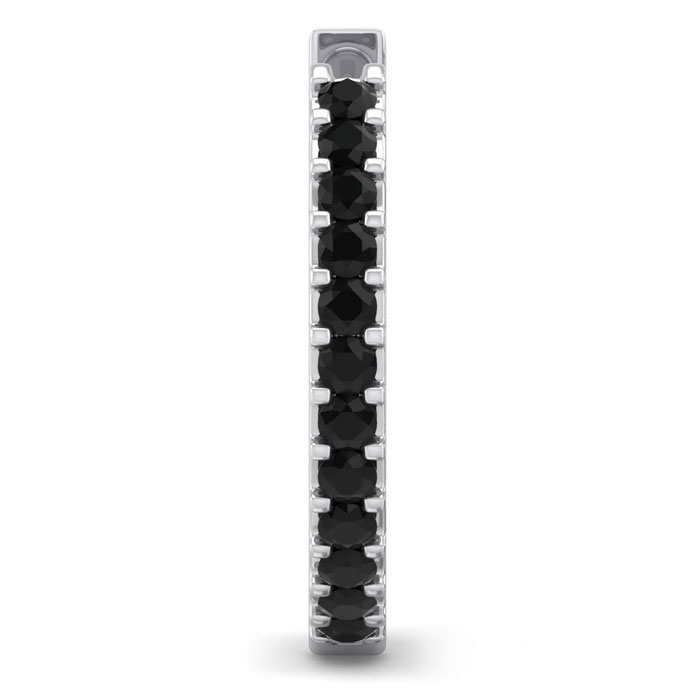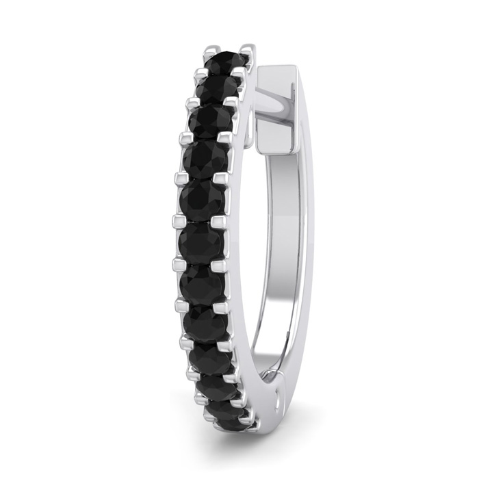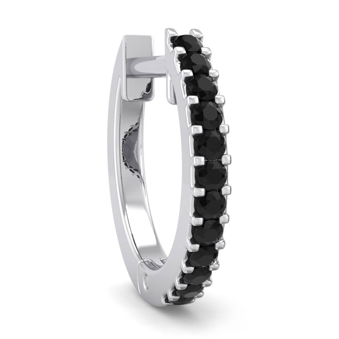 This elegant mens black diamond hoop earring features 12 black diamonds in I3 clarity totaling 0.06 carat. This earring is in 14 karat white gold and has comfortable and secure hidden snap backs.