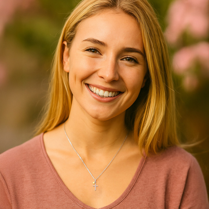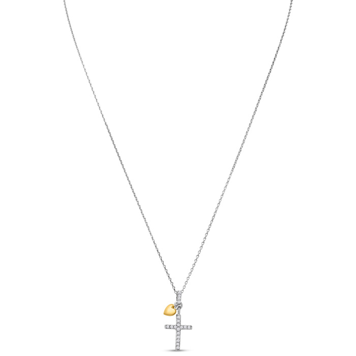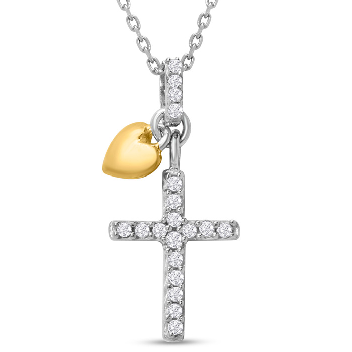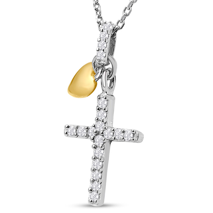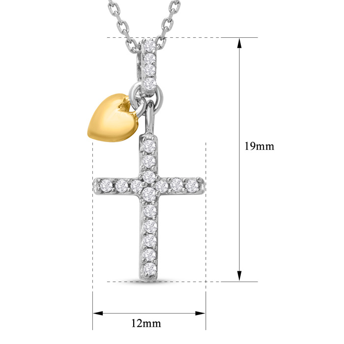 This classic cross necklace features 19 sparkling diamonds in J-K color, I1-I2 clarity weighing 0.15 carats. The cross is 3/4 inch long and has a 14k yellow gold over sterling silver hanging heart charm. This necklace is in sterling silver and has an 18 inch cable chain with a spring-ring clasp.