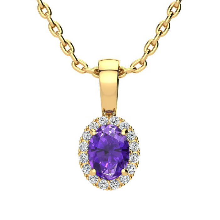 1/2 Carat Oval Shape Amethyst and Halo Diamond Necklace In 14 Karat Yellow Gold With 18 Inch Chain