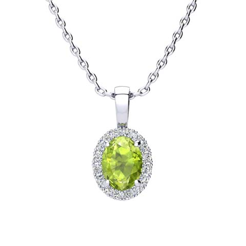 1/2 Carat Oval Shape Peridot and Halo Diamond Necklace In 14 Karat White Gold With 18 Inch Chain