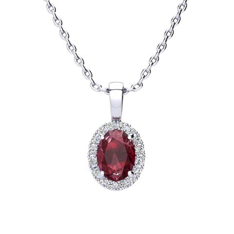 0.62 Carat Oval Shape Ruby and Halo Diamond Necklace In 14 Karat White Gold With 18 Inch Chain