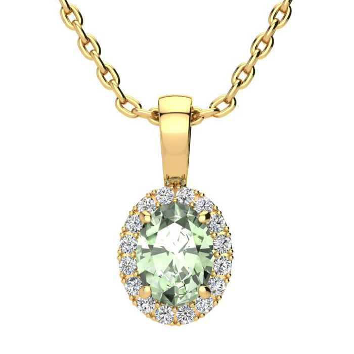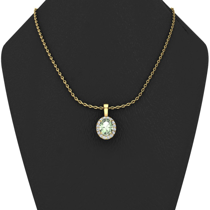 3/4 Carat Oval Shape Green Amethyst and Halo Diamond Necklace In 14 Karat Yellow Gold With 18 Inch Chain