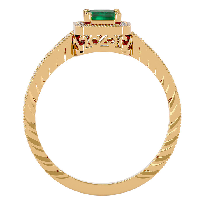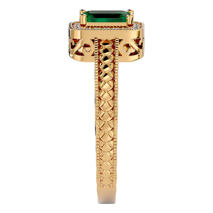 This antique style gemstone ring features a 6x4mm emerald cut emerald gemstone weighing approximately 3/4 carat. There are 20 side diamonds in I-J color, I1-I2 clarity totaling approximately 1/10 carat. Total carat weight is approximately 0.85 carats. This ring is in 14 karat yellow gold.