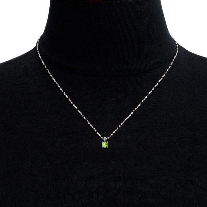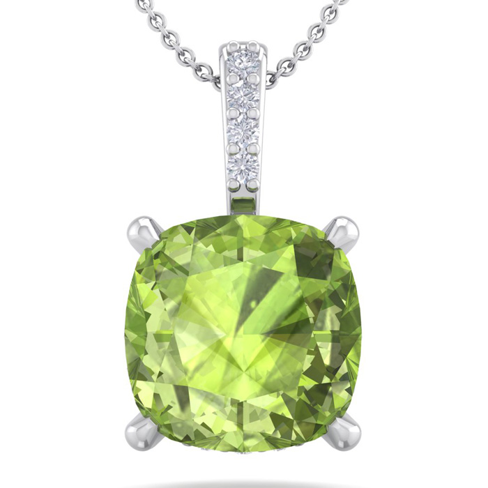 This elegant gemstone and diamond necklace features one 6mm cushion cut peridot gemstone at approximately 1 1/10 carat. It is accented with 15 sparkling diamonds in I-J color, I1-I2 clarity at 0.04 carats total. Total gem weight is approximately 1.14 carats. This necklace is in 14 karat white gold. This necklace comes with an 18 inch cable chain with a spring-ring clasp.