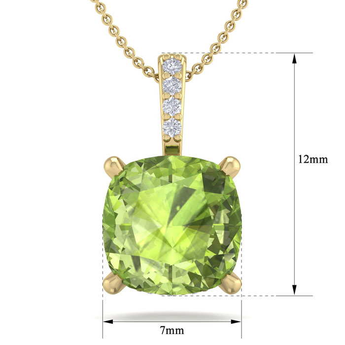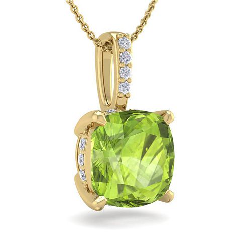 This elegant gemstone and diamond necklace features one 6mm cushion cut peridot gemstone at approximately 1 1/10 carat. It is accented with 15 sparkling diamonds in I-J color, I1-I2 clarity at 0.04 carats total. Total gem weight is approximately 1.14 carats. This necklace is in 14 karat yellow gold. This necklace comes with an 18 inch cable chain with a spring-ring clasp.