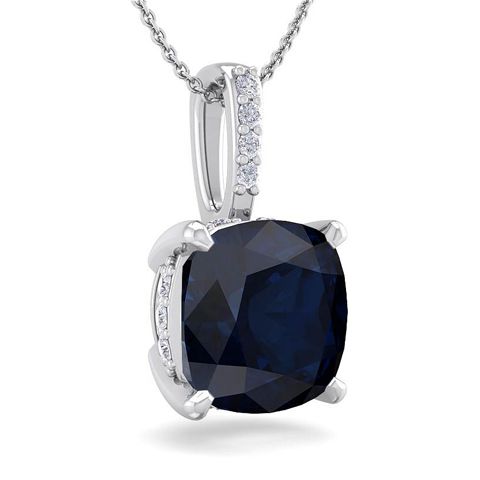 This elegant gemstone and diamond necklace features one 6mm cushion cut created sapphire gemstone at approximately 1.06 carats. It is accented with 15 sparkling diamonds in I-J color, I1-I2 clarity at 0.04 carats total. Total gem weight is approximately 1 1/10 carat. This necklace is in 14 karat white gold. This necklace comes with an 18 inch cable chain with a spring-ring clasp.