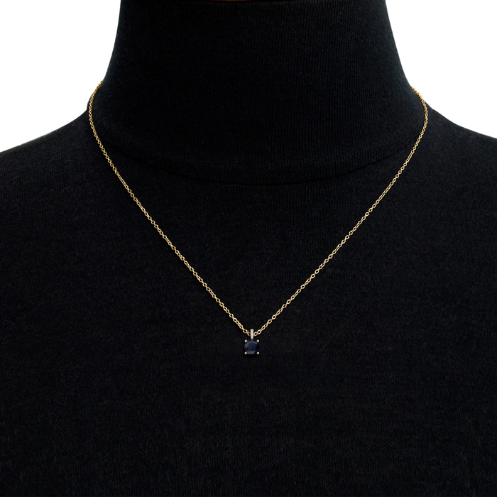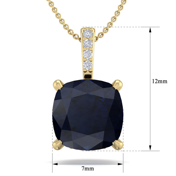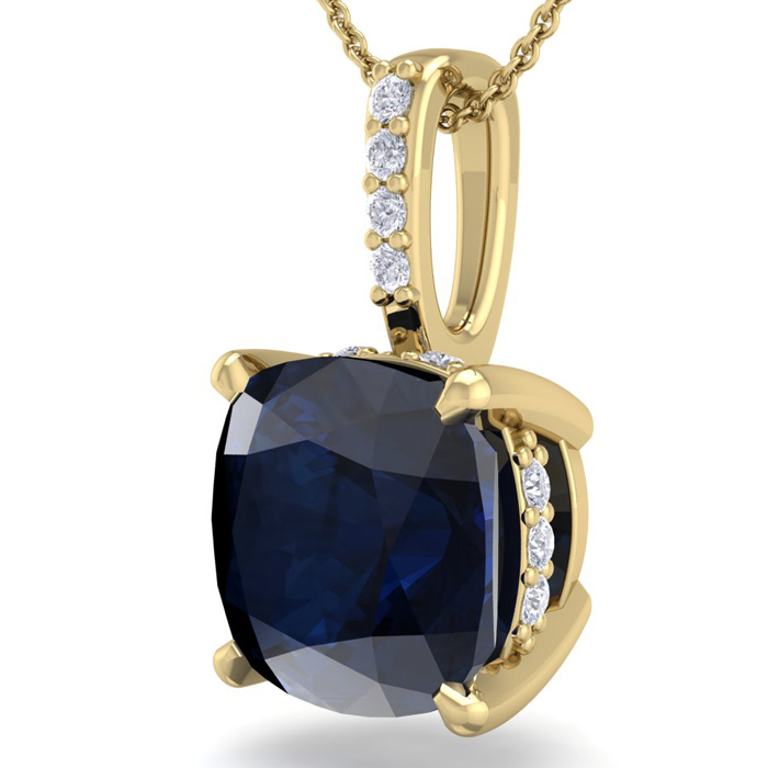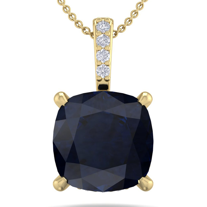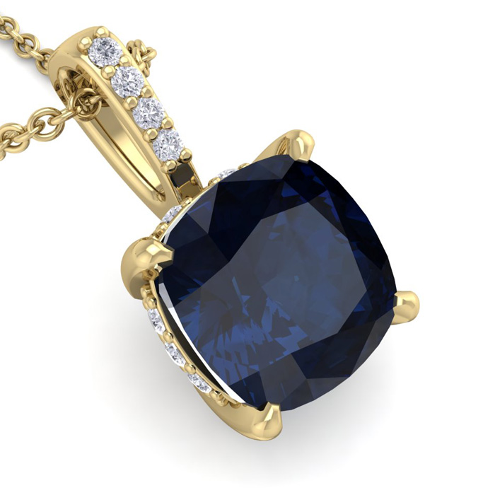 This elegant gemstone and diamond necklace features one 6mm cushion cut created sapphire gemstone at approximately 1.06 carats. It is accented with 15 sparkling diamonds in I-J color, I1-I2 clarity at 0.04 carats total. Total gem weight is approximately 1 1/10 carat. This necklace is in 14 karat yellow gold. This necklace comes with an 18 inch cable chain with a spring-ring clasp.