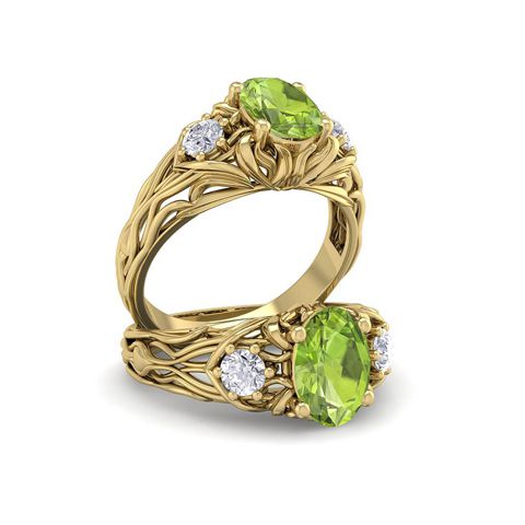 1 1/10 Carat Oval Shape Peridot and Diamond Intricate Vine Engagement Ring In 14 Karat Yellow Gold