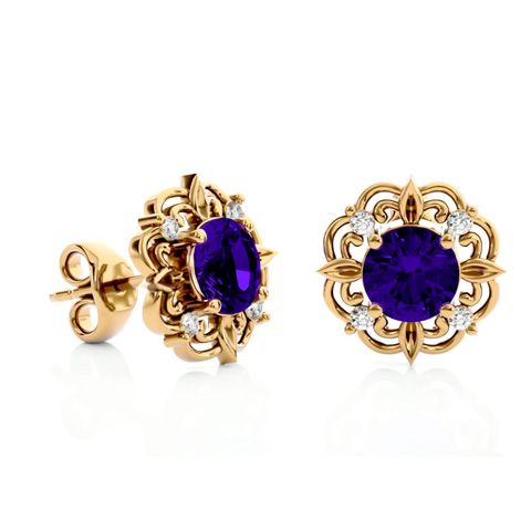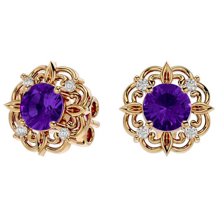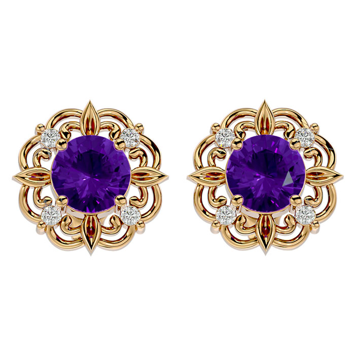 These elegant gemstone earrings feature two 6mm amethyst gemstones at approximately 1.40 carats. They are surrounded by 8 sparkling diamonds in I-J color, I1-I2 clarity at 1/10 carat total weight. Total gem weight is approximately 1 1/2 carats. These earrings are in 14 karat yellow gold and have comfortable and secure friction backs.