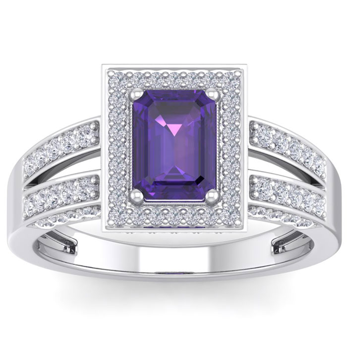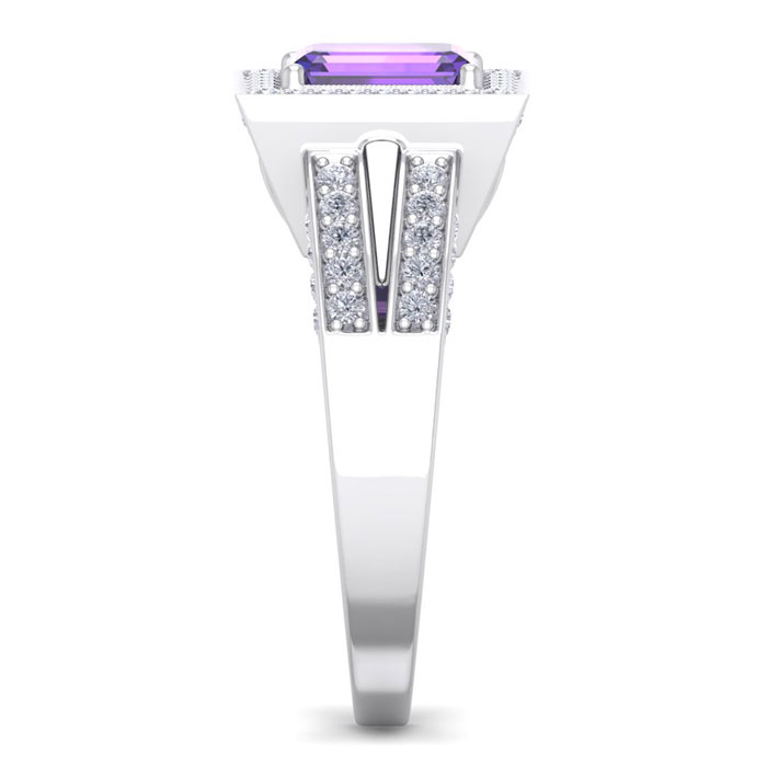 This elegant gemstone and diamond ring features one 7x5mm emerald cut amethyst gemstone at approximately 0.90 carats. It is surrounded by 74 sparkling diamonds in I-J color, I1-I2 clarity at 0.62 carat total weight. Total gem weight is approximately 1 1/2 carats. This ring is in 14 karat white gold.