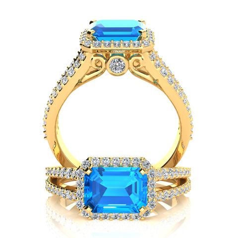 This stunning gemstone and halo diamond ring features one 7x5mm emerald shape blue topaz gemstone at 1.20 carats. It is surrounded by 72 sparkling diamonds in a halo and down the band in H-I color, I1-I2 clarity at 0.42 carats. Total gem weight is 1.62 carats. This ring is crafted in 14 karat yellow gold.