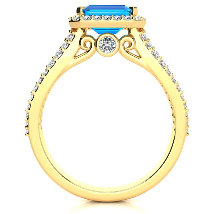 This stunning gemstone and halo diamond ring features one 7x5mm emerald shape blue topaz gemstone at 1.20 carats. It is surrounded by 72 sparkling diamonds in a halo and down the band in H-I color, I1-I2 clarity at 0.42 carats. Total gem weight is 1.62 carats. This ring is crafted in 14 karat yellow gold.