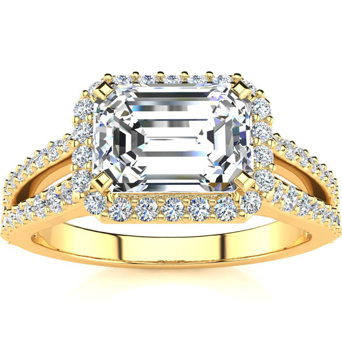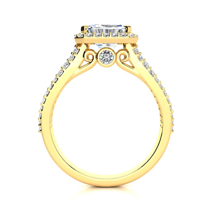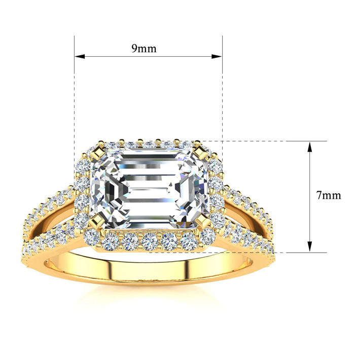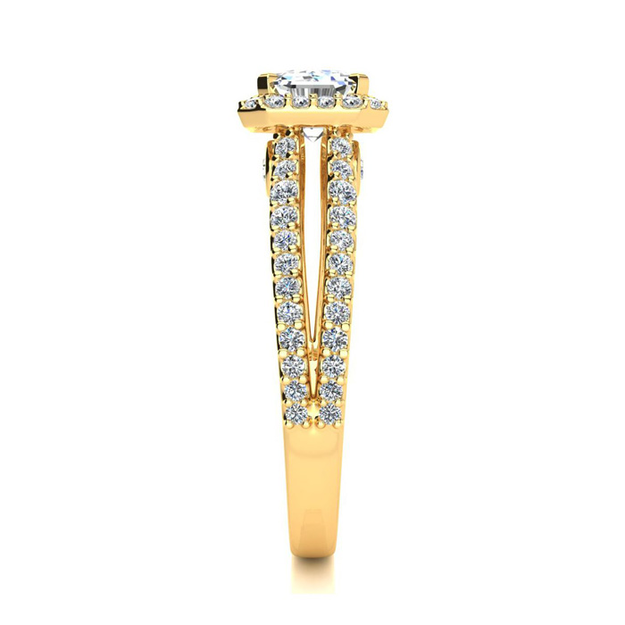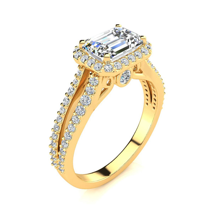 This stunning lab grown diamond ring features one 7x5mm emerald shape center weighing approximately 1 carat. It is surrounded by 72 sparkling lab grown diamonds in a halo and down the band in G-H color, VS clarity at 1/2 carat. Total gem weight is 1 1/2 carats. This ring is crafted in 14 karat yellow gold.