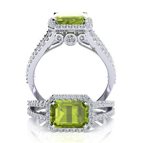 This stunning gemstone and halo diamond ring features one 7x5mm emerald shape peridot gemstone at 1.15 carats. It is surrounded by 72 sparkling diamonds in a halo and down the band in H-I color, I1-I2 clarity at 0.42 carats. Total gem weight is 1.57 carats. This ring is crafted in 14 karat white gold.