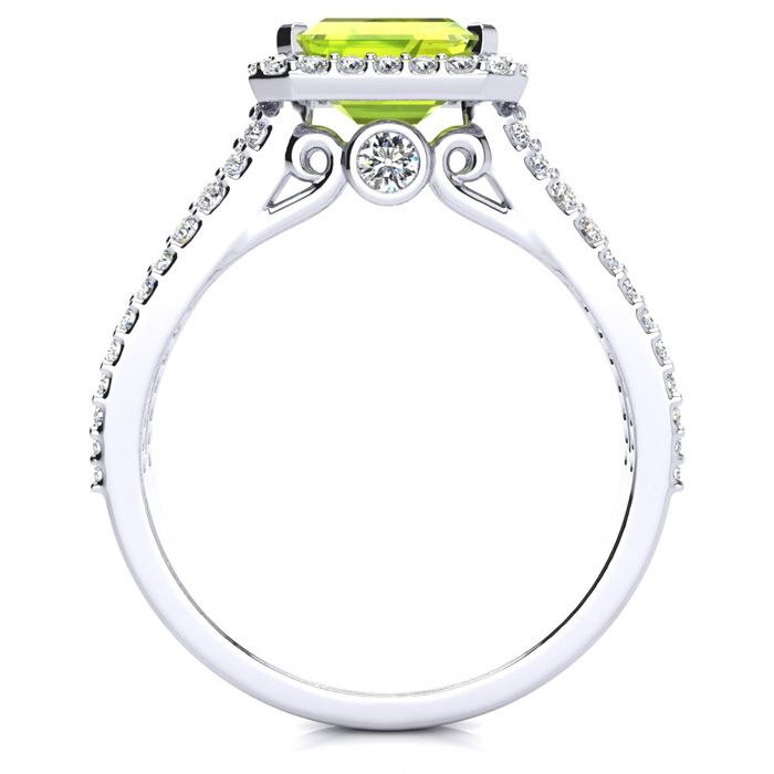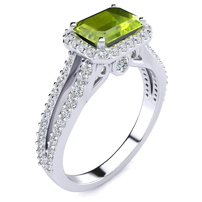 This stunning gemstone and halo diamond ring features one 7x5mm emerald shape peridot gemstone at 1.15 carats. It is surrounded by 72 sparkling diamonds in a halo and down the band in H-I color, I1-I2 clarity at 0.42 carats. Total gem weight is 1.57 carats. This ring is crafted in 14 karat white gold.