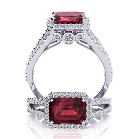 This stunning gemstone and halo diamond ring features one 7x5mm emerald shape ruby gemstone at 1.00 carats. It is surrounded by 72 sparkling diamonds in a halo and down the band in H-I color, I1-I2 clarity at 0.42 carats. Total gem weight is 1.42 carats. This ring is crafted in 14 karat white gold.