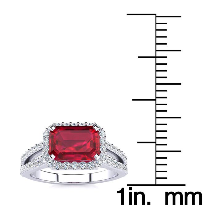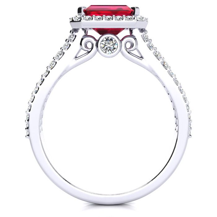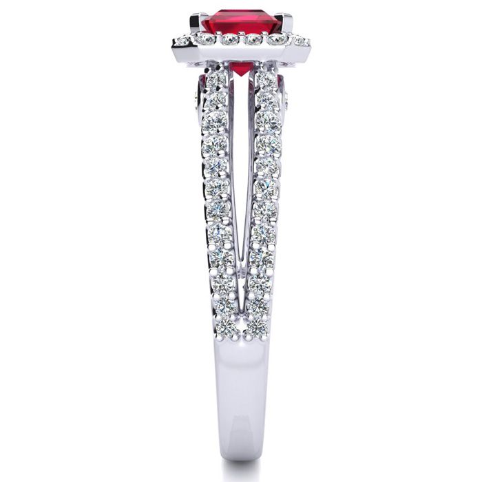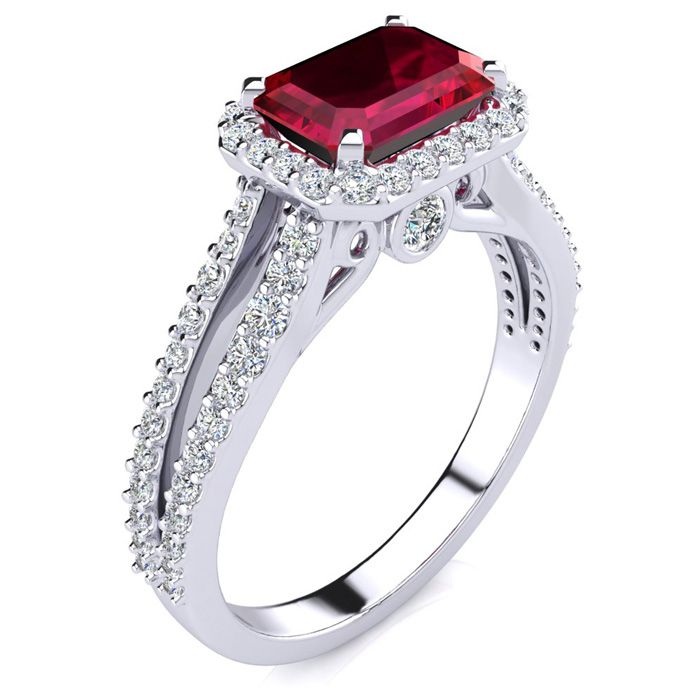 This stunning gemstone and halo diamond ring features one 7x5mm emerald shape ruby gemstone at 1.00 carats. It is surrounded by 72 sparkling diamonds in a halo and down the band in H-I color, I1-I2 clarity at 0.42 carats. Total gem weight is 1.42 carats. This ring is crafted in 14 karat white gold.