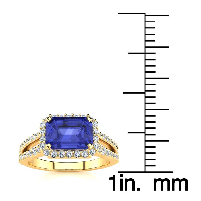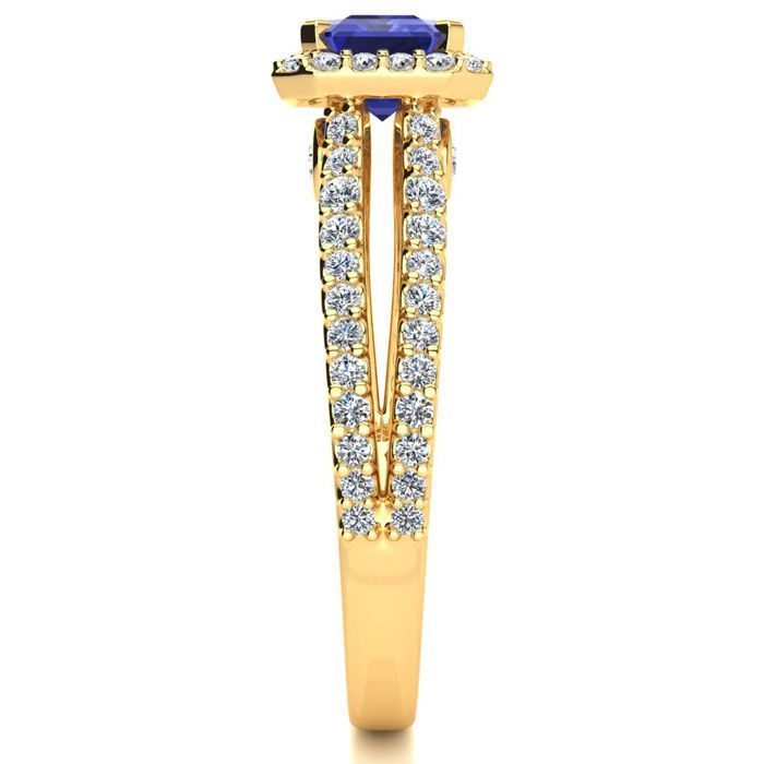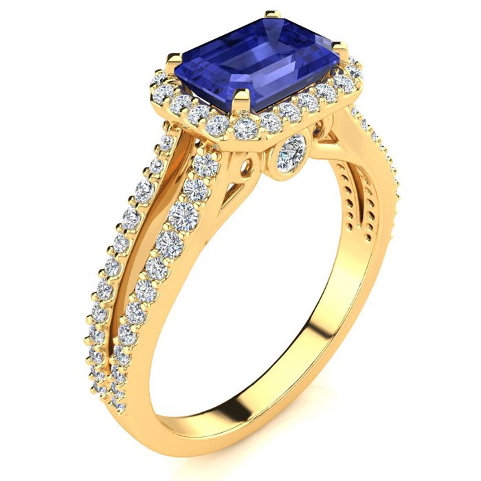 This stunning gemstone and halo diamond ring features one 7x5mm emerald shape tanzanite gemstone at 1.15 carats. It is surrounded by 72 sparkling diamonds in a halo and down the band in H-I color, I1-I2 clarity at 0.42 carats. Total gem weight is 1.57 carats. This ring is crafted in 14 karat yellow gold.