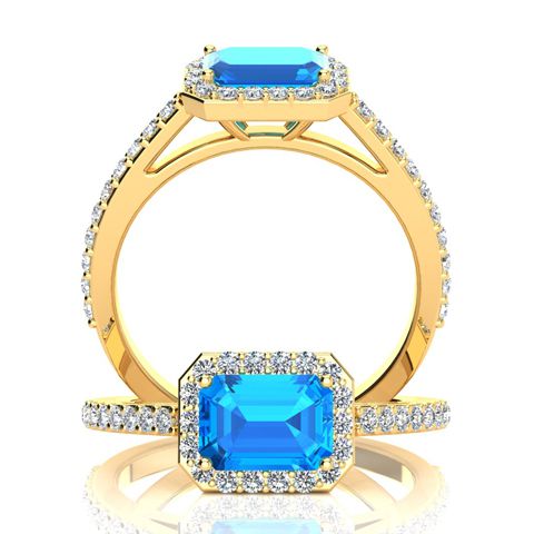 This stunning gemstone and halo diamond ring features one 7x5mm emerald shape blue topaz gemstone at 1.20 carats. It is surrounded by 42 sparkling diamonds in a halo and down the band in H-I color, I1-I2 clarity at 0.31 carats. Total gem weight is 1.51 carats. This ring is crafted in 14 karat yellow gold.