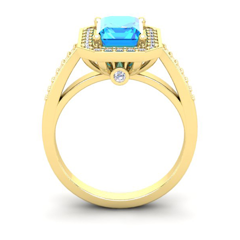 This stunning gemstone and halo diamond ring features one 7x5mm emerald shape blue topaz gemstone at 1.20 carats. It is surrounded by 40 sparkling diamonds in a halo and down the band in I-J color, SI2-I1 clarity at 0.22 carats. Total gem weight is 1.41 carats. This ring is crafted in 14 karat yellow gold.