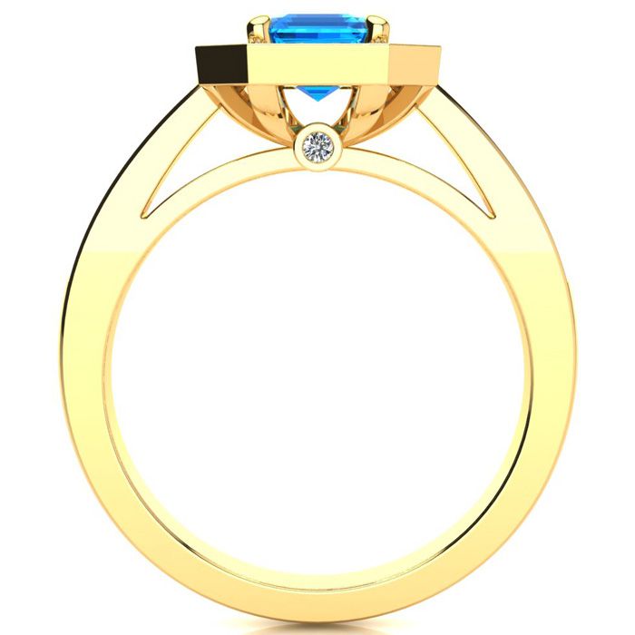 This stunning gemstone and halo diamond ring features one 7x5mm emerald shape blue topaz gemstone at 1.20 carats. It is surrounded by 40 sparkling diamonds in a halo and down the band in I-J color, SI2-I1 clarity at 0.22 carats. Total gem weight is 1.41 carats. This ring is crafted in 14 karat yellow gold.