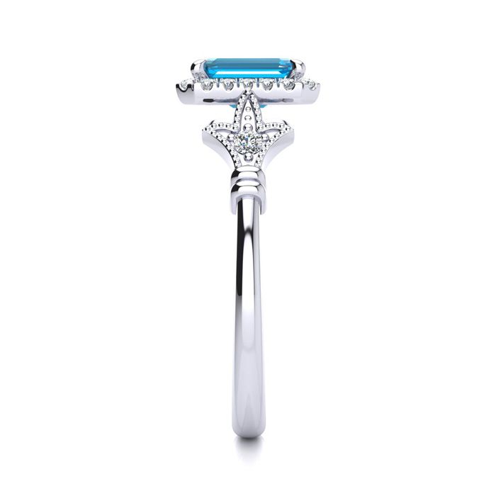 This stunning gemstone and halo diamond vintage ring features one 7x5mm emerald cut blue topaz gemstone at 1.20 carats. It is surrounded by 22 sparkling diamonds in a halo and down the band in H-I color, I1-I2 clarity at 0.25 carats. Total gem weight is 1.45 carats. This ring is crafted in 14 karat white gold. *Retrograde Birthstones™ flips the idea of traditional birthstones. Wear your ½ birthday birthstone, your Retrograde Birthstone, “The Birthstone For Your Bad Side™.