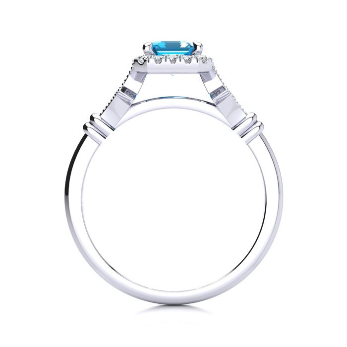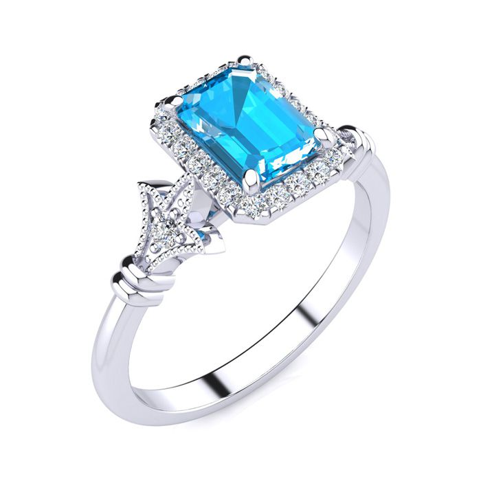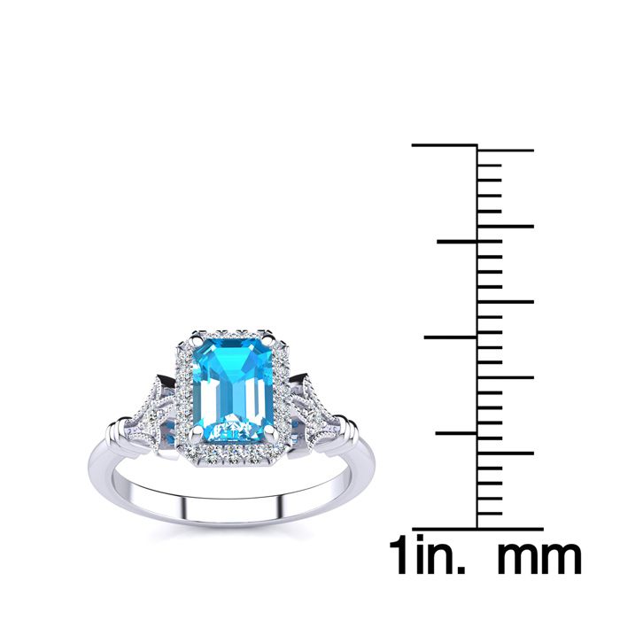 This stunning gemstone and halo diamond vintage ring features one 7x5mm emerald cut blue topaz gemstone at 1.20 carats. It is surrounded by 22 sparkling diamonds in a halo and down the band in H-I color, I1-I2 clarity at 0.25 carats. Total gem weight is 1.45 carats. This ring is crafted in 14 karat white gold. *Retrograde Birthstones™ flips the idea of traditional birthstones. Wear your ½ birthday birthstone, your Retrograde Birthstone, “The Birthstone For Your Bad Side™.