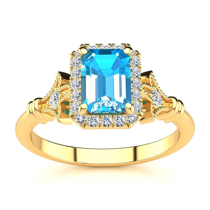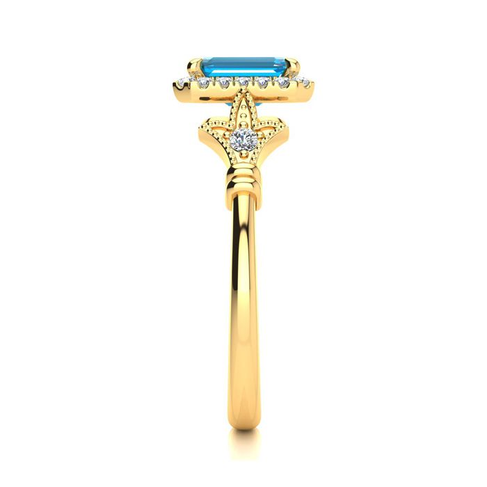 This stunning gemstone and halo diamond vintage ring features one 7x5mm emerald cut blue topaz gemstone at 1.20 carats. It is surrounded by 22 sparkling diamonds in a halo and down the band in H-I color, I1-I2 clarity at 0.25 carats. Total gem weight is 1.45 carats. This ring is crafted in 14 karat yellow gold. *Retrograde Birthstones™ flips the idea of traditional birthstones. Wear your ½ birthday birthstone, your Retrograde Birthstone, “The Birthstone For Your Bad Side™.
