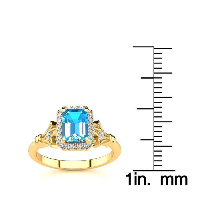 Retrograde Birthstones™ 1 1/2 Carat Blue Topaz and Halo Diamond Vintage Ring In 14 Karat Yellow Gold