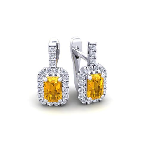 These stunning gemstone and halo diamond earrings feature two 6x4mm emerald cut citrine gemstones at 1.10 carats. The gemstones are surrounded by 38 sparkling diamonds in a halo in I-J color, SI2-I1 clarity at 0.48 carats. Total gem weight is 1.58 carats. These earrings are crafted in 14 karat white gold and come with comfortable and secure snap backs.