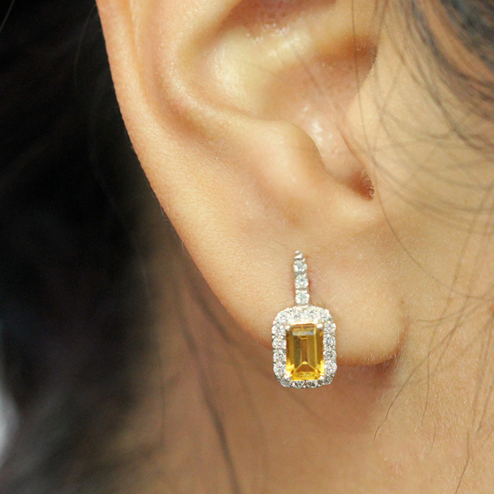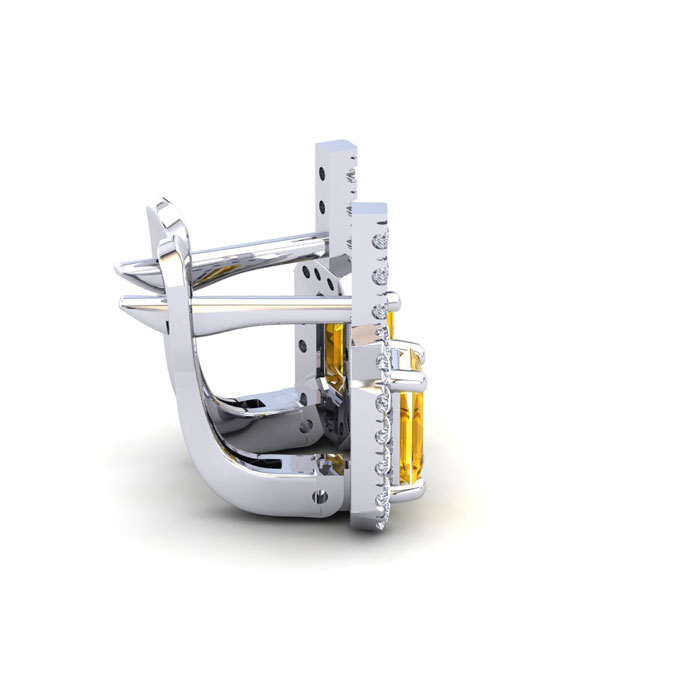 These stunning gemstone and halo diamond earrings feature two 6x4mm emerald cut citrine gemstones at 1.10 carats. The gemstones are surrounded by 38 sparkling diamonds in a halo in I-J color, SI2-I1 clarity at 0.48 carats. Total gem weight is 1.58 carats. These earrings are crafted in 14 karat white gold and come with comfortable and secure snap backs.