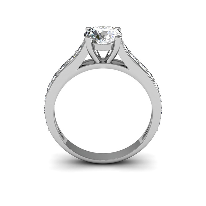Beautiful classically elegant diamond engagement ring that will make any bride happy. With 1.50 carats of fiery diamonds, this engagement ring includes a 1 carat clarity enhanced round brilliant center diamond and 16 shimmering diamonds set in milgrain channels on the band. White K-L color diamonds of I2-I3 clarity and mounted in 14k white gold.