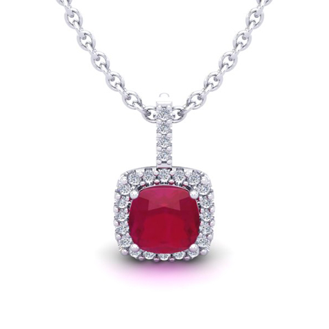 1 1/2 Carat Cushion Cut Ruby and Halo Diamond Necklace In 14 Karat White Gold, 18 Inches