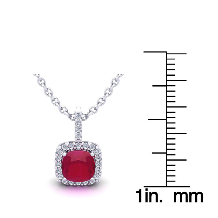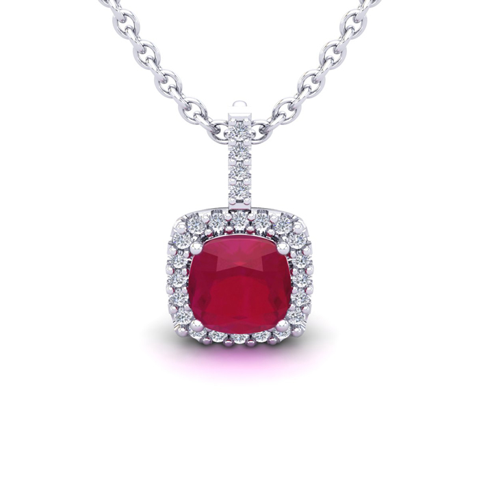 1 1/2 Carat Cushion Cut Ruby and Halo Diamond Necklace In 14 Karat White Gold, 18 Inches