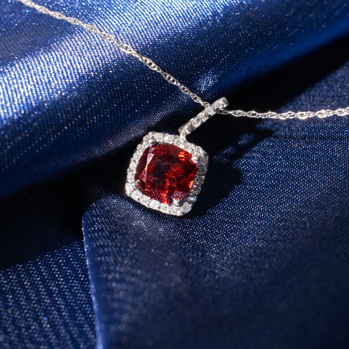 This stunning gemstone and halo diamond necklace features one 6x6mm cushion cut created ruby gemstone at 1.38 carats. It is surrounded by 26 sparkling diamonds in a halo in I-J color, SI2-I1 clarity at 0.13 carats. Total gem weight is 1.51 carats. This necklace is crafted in 14 karat white gold and comes with an 18 inch cable chain with spring-ring clasp.