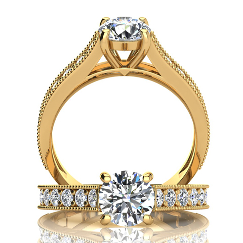 Beautiful traditional and timeless diamond engagement ring that will make any bride happy. With 1.50 carats of fiery diamonds, this engagement ring includes a 1 carat clarity enhanced round brilliant center diamond and 16 shimmering diamonds set in milgrain channels on the band. White I-J color diamonds of I1-I2 clarity and mounted in 14k yellow gold.
