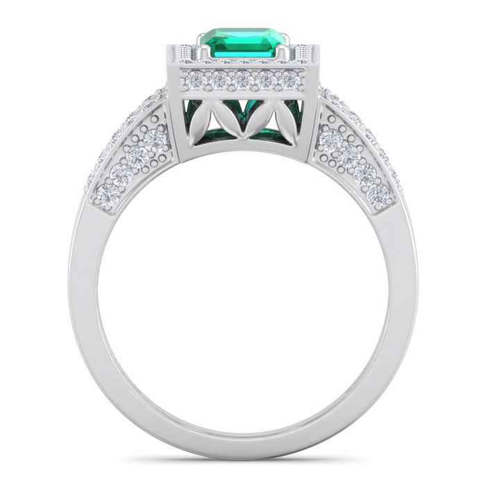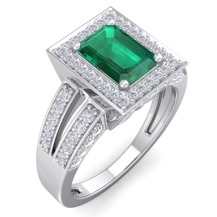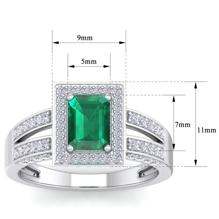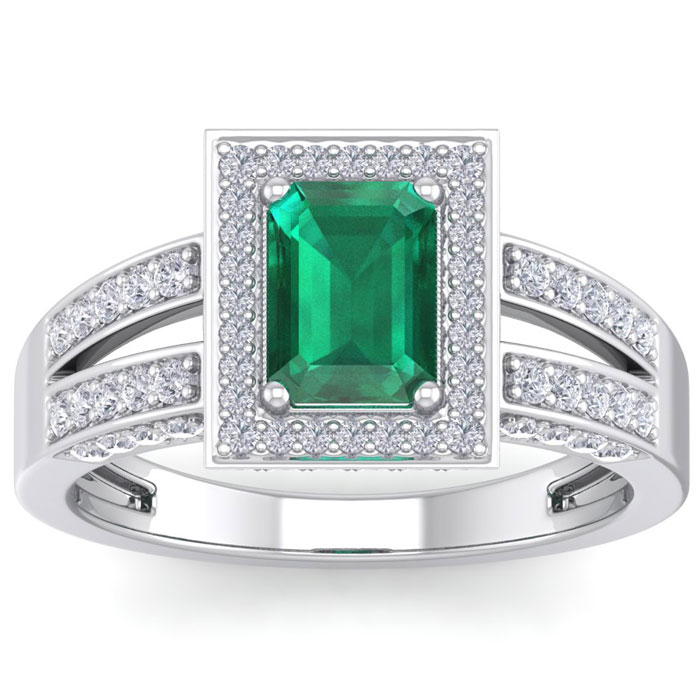 This elegant gemstone and diamond ring features one 7x5mm emerald cut emerald gemstone at approximately 0.90 carats. It is surrounded by 74 sparkling diamonds in I-J color, I1-I2 clarity at 0.62 carat total weight. Total gem weight is approximately 1 1/2 carats. This ring is in 14 karat white gold.