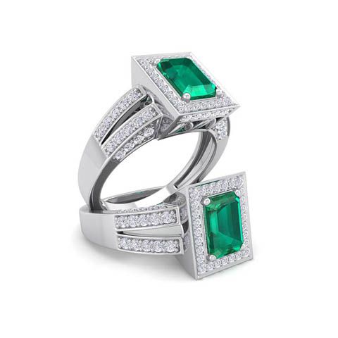 This elegant gemstone and diamond ring features one 7x5mm emerald cut emerald gemstone at approximately 0.90 carats. It is surrounded by 74 sparkling diamonds in I-J color, I1-I2 clarity at 0.62 carat total weight. Total gem weight is approximately 1 1/2 carats. This ring is in 14 karat white gold.