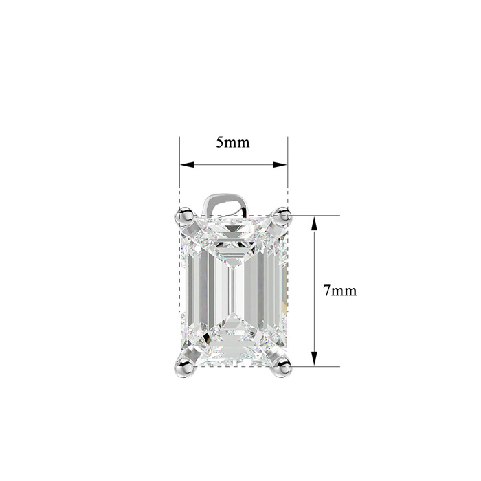 These classic moissanite stud earrings feature two 7x5mm emerald shape moissanite gemstones in E-F color, VVS1-VVS2 clarity. Each moissanite weighs approximately 3/4 carat for a total weight of 1 1/2 carats. These earrings are in 14 karat white gold and have comfortable and secure post with friction backs.