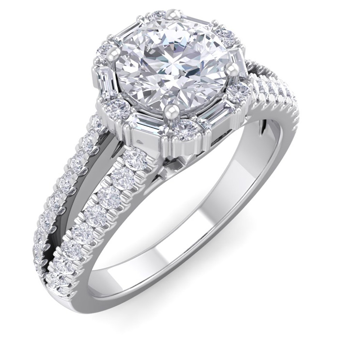 This fancy engagement ring stuns with a round shape center diamond that is surrounded by stunning baguette diamonds in a halo. The center diamond measures approximately 6.2mm at 1.00 carats. The baguettes total approximately 0.12 carats. There are 42 diamonds along the split shank band totaling at 0.42 carats. Total gem weight of the ring is approximately 1.54 carats in H-I color, SI2-I1 clarity. This ring is in 14 karat white gold.