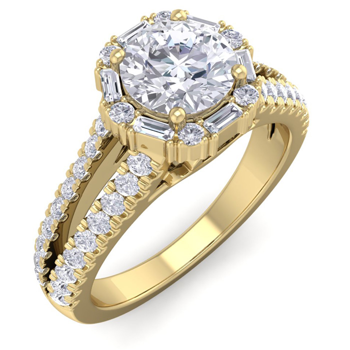 This fancy engagement ring stuns with a round shape center diamond that is surrounded by stunning baguette diamonds in a halo. The center diamond measures approximately 6.2mm at 1.00 carats. The baguettes total approximately 0.12 carats. There are 42 diamonds along the split shank band totaling at 0.42 carats. Total gem weight of the ring is approximately 1.54 carats in H-I color, SI2-I1 clarity. This ring is in 14 karat yellow gold.