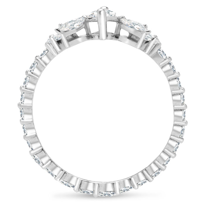 This lab grown diamond ring features marquise, pear and round shape lab grown diamonds totaling 1 1/2 carats. This ring is an eternity style with diamonds going all away around the band. Diamond color is G-H, diamond clarity is VS. This ring is in sterling silver.