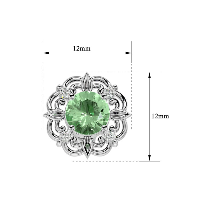 These elegant gemstone earrings feature two 6mm green amethyst gemstones at approximately 1.40 carats. They are surrounded by 8 sparkling diamonds in I-J color, I1-I2 clarity at 1/10 carat total weight. Total gem weight is approximately 1 1/2 carats. These earrings are in 14 karat white gold and have comfortable and secure friction backs. *Retrograde Birthstones™ flips the idea of traditional birthstones. Wear your ½ birthday birthstone, your Retrograde Birthstone, “The Birthstone For Your Bad Side™.