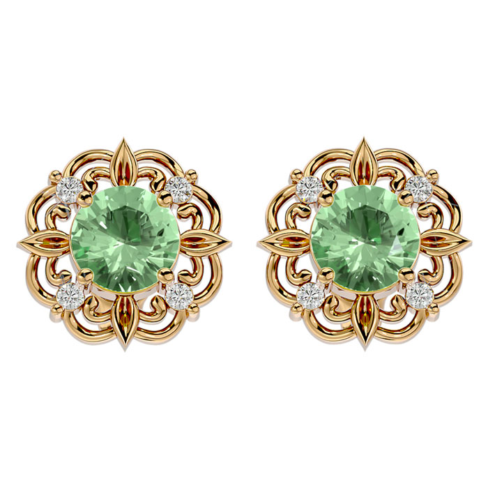These elegant gemstone earrings feature two 6mm green amethyst gemstones at approximately 1.40 carats. They are surrounded by 8 sparkling diamonds in I-J color, I1-I2 clarity at 1/10 carat total weight. Total gem weight is approximately 1 1/2 carats. These earrings are in 14 karat yellow gold and have comfortable and secure friction backs.