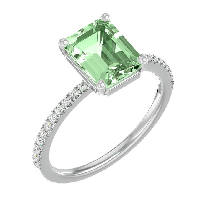 This stunning gemstone and diamond ring features one 8x6mm emerald shape green amethyst gemstone at 1.50 carats. It is surrounded by 22 sparkling diamonds along the band in I-J color, I1-I2 clarity at 0.18 carats. Total gem weight is 1.68 carats. This ring is crafted in 14 karat white gold.