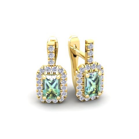 These stunning gemstone and halo diamond earrings feature two 6x4mm emerald cut green amethyst gemstones at 1.10 carats. The gemstones are surrounded by 38 sparkling diamonds in a halo in I-J color, SI2-I1 clarity at 0.48 carats. Total gem weight is 1.58 carats. These earrings are crafted in 14 karat yellow gold and come with comfortable and secure snap backs.
