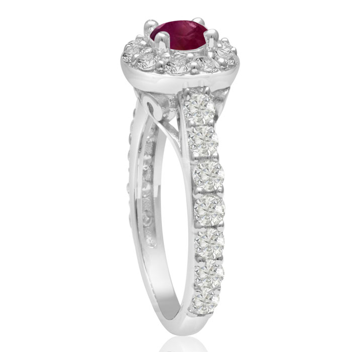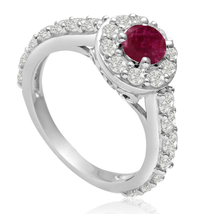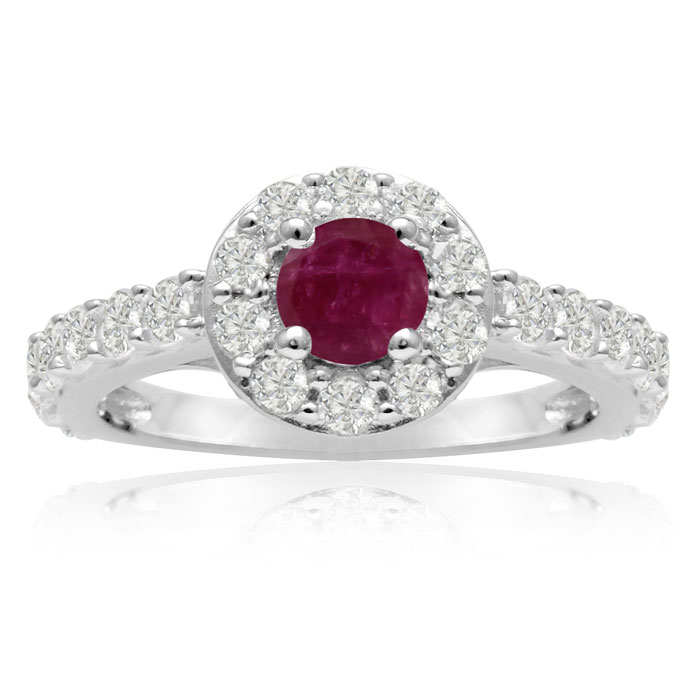 For a classically beautiful diamond engagement ring, try this engagement ring crafted in 14 karat white gold. This ring boasts a 1/2 carat center ruby surrounded by a halo of diamonds. The ring has a total carat weight of 1 1/2 carats. There are 24 diamonds total in H-I color and SI2-I1 clarity.