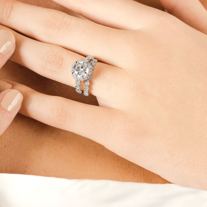 This fabulous diamond bridal set features a sparkling 1 carat round shape center diamond in H-I color, SI2-I1 clarity. It is surrounded by 55 side diamonds between the ring and band totaling 1/2 carat. Total carat weight is 1 1/2 carats. This ring is in 14 karat white gold.