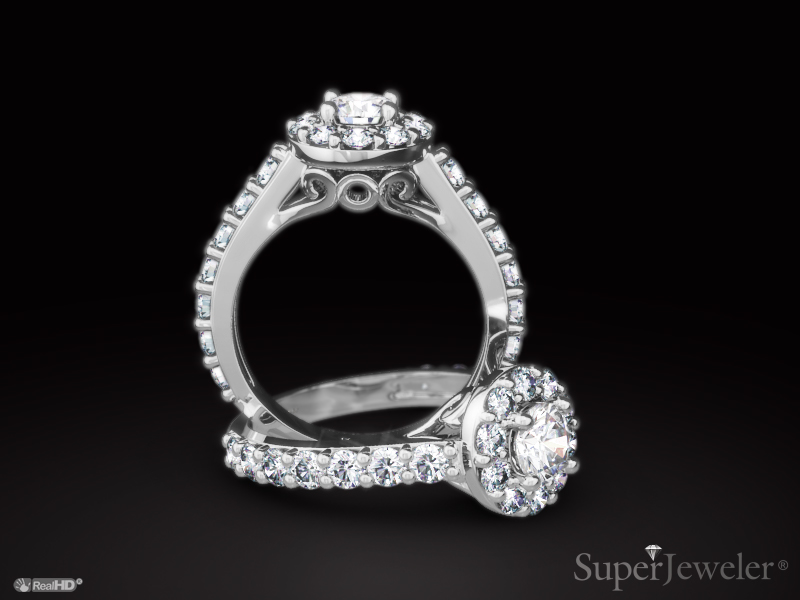 For a classically beautiful diamond engagement ring, try this engagement ring crafted in 14 karat white gold. This ring boasts a 1/2 carat center diamond surrounded by a halo of diamonds. The ring has a total diamond weight of 1 1/2 carats. There are 25 diamonds total in H-I color and SI2-I1 clarity.