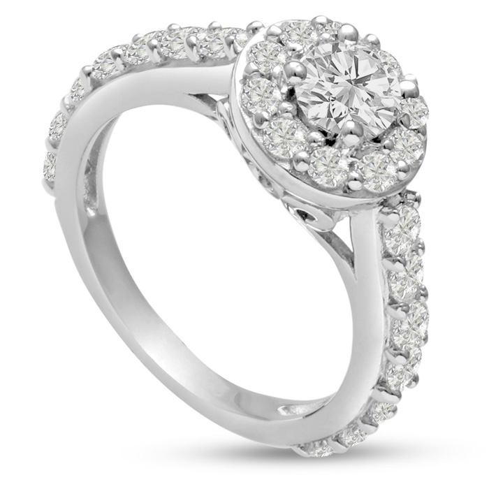 For a classically beautiful diamond engagement ring, try this engagement ring crafted in 14 karat white gold. This ring boasts a 1/2 carat center diamond surrounded by a halo of diamonds. The ring has a total diamond weight of 1 1/2 carats. There are 25 diamonds total in H-I color and SI2-I1 clarity.